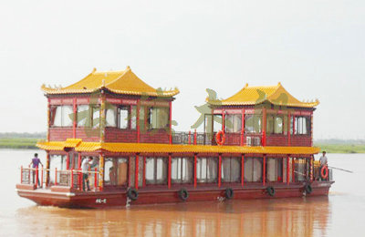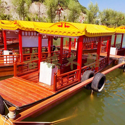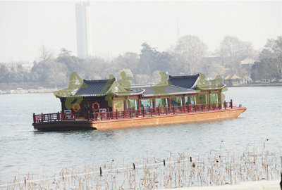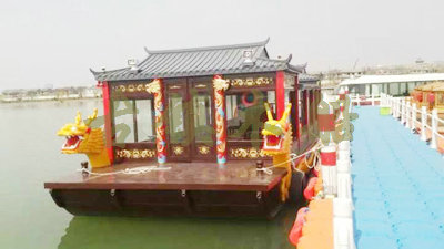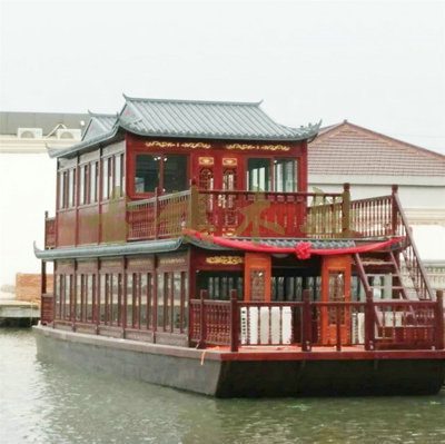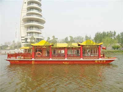 畫舫船就是裝飾古典華麗的游船,是"中國風"的仿古游船,結(jié)合古典園林建筑,體現(xiàn)了中華文明的古典藝術(shù).畫舫船豪華而又古典,船上的建筑按照中國古代建筑里的亭臺樓閣,建筑工藝之復雜,要求之嚴格,仿古畫舫游船的特點飛檐翹角、玲瓏精致的四角亭子逐漸成形,赫然立于船頭,美人靠、盤龍柱子、彩畫……龍柱上的浮雕盤龍和祥云一層扣著一層,層層錯落有致,雕刻精細到盤龍身上的每一個鱗片都細細可數(shù),古代皇家標志性元素,在畫舫船上體現(xiàn)的淋漓盡致。除了雕刻、花窗,整條船還有一個看點,那就是弧線優(yōu)美、高高翹起的船尾。游船并不大,長約10米、寬3米,但是整體看起來堪稱一件藝術(shù)品。船尾的雕花欄桿與船艙、船頭的雕刻遙相呼應(yīng),船身四周貼著浮雕祥云,給整條船增添了富貴、華麗的氣質(zhì)。